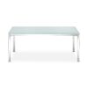 Le plateau de la table est réalisé en verre ou en bois. La structure et le piètement sont réalisés en tubes métalliques cylindriques chromés.