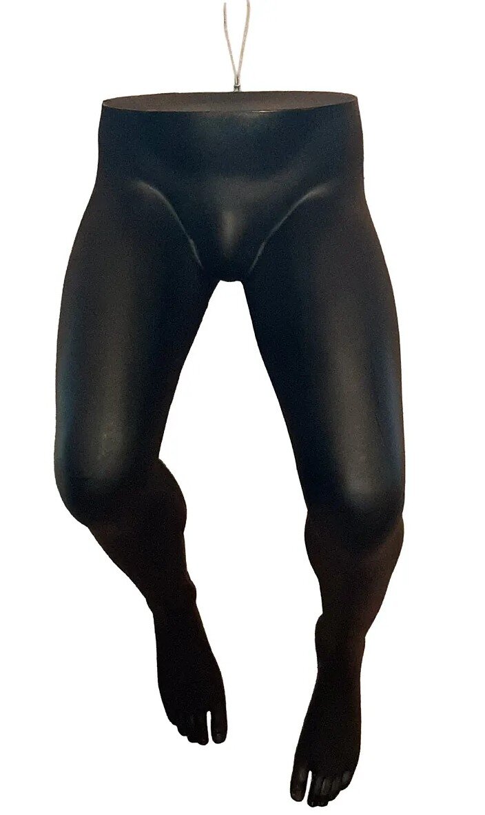 Mannequin jambe homme noire pliée à suspendre, conçu en polyéthylène haute résistance. Léger, 100 % recyclable, résistant aux chocs et aux UV, idéal pour vitrines et présentations en magasin.